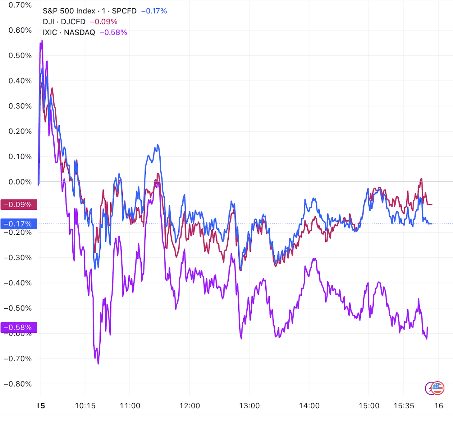 截至收盘,道琼斯指数跌0.09%,报48,416.56点;标普500指数跌0.16%,报6,816.51 点;纳斯达克指数跌0.59%,报23,057.41点。