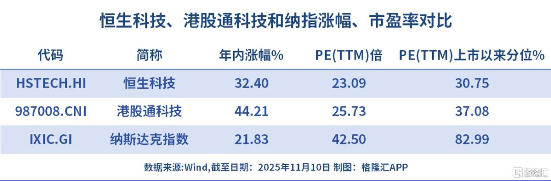 尽管港股科技、恒生科技今年领涨全球,大幅跑赢纳指,但估值仍处于中底部区间。