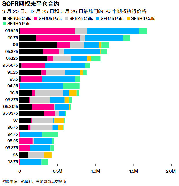 SOFR期权热力图:95.625仍是9月、12月、3月三个到期日里最受欢迎的点位,9月与12月看跌期权在该价位风险敞口最大;95.75和95.875亦成交活跃,其中9月25日看跌期权出现频率最高。最新动态显示,资金正持续买入SFRZ5