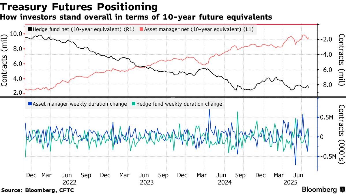 CFTC期货持仓:截至7月29日(美联储利率决议前一天)的一周,对冲基金大举增持10年期国债期货净空头,资产管理公司则反向增配10年期及更长久期合约的净多头,双方分歧显著。