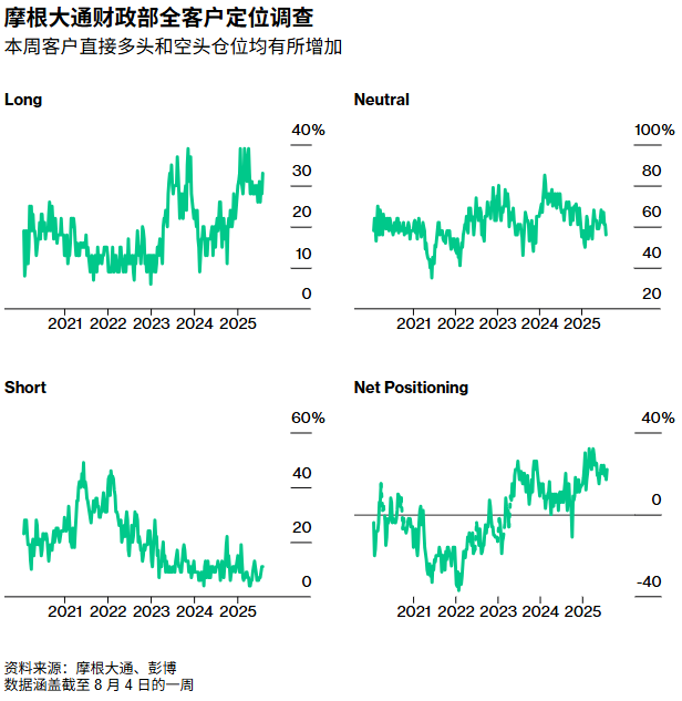 摩根大通客户持仓:截至8月4日当周,客户将美债多头仓位一次性提高5个百分点,总量升至4月14日以来最高;净多头也刷新7月7日峰值,单周增幅为3月底以来最大。