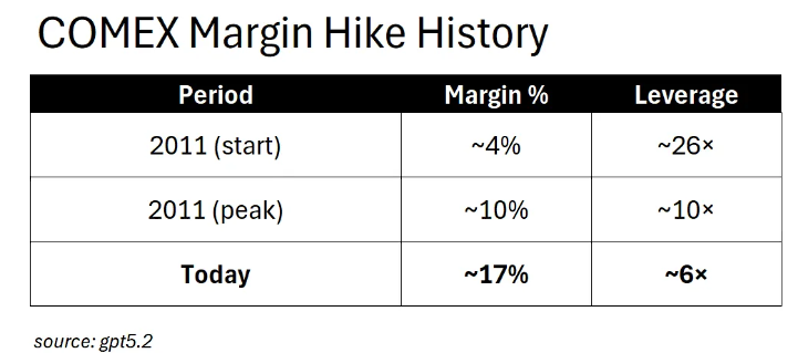 Campbell承认这会降低杠杆和投机需求,但他指出当前保证金水平已达名义价值的17%,远高于2011年银价崩盘时的最高水平10%。目前的杠杆倍数仅为6倍,而2011年初曾高达25倍。因此本次保证金上调的冲击远小于2011年的连续加码。