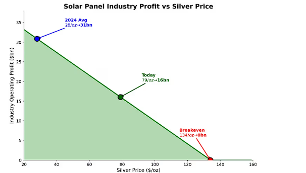 数据中心和人工智能的电力需求进一步强化了这一逻辑链条:"每次AI查询都需要电子,边际电子来自太阳能,太阳能需要白银。"Campbell表示,太阳能行业的盈亏平衡点在每盎司134美元,较当前现货价格高出约70%。