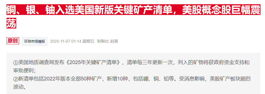 值得一提的是,一同被列入关键矿产名单的铜在日内也创下新高——LME铜期货最高报每吨11215美元。