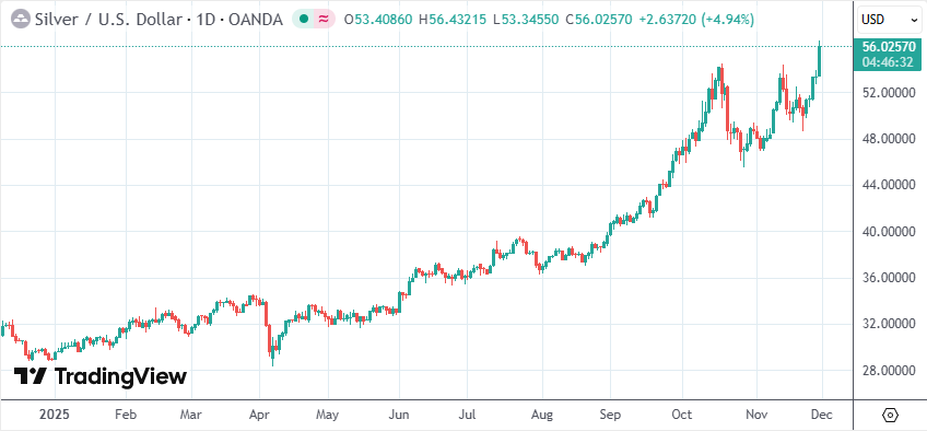分析认为,由于市场对美联储在12月降息的预期升温、资金流入以实物白银为支撑的ETF,再加上供应持续紧张,使白银价格获得了强劲支撑。
