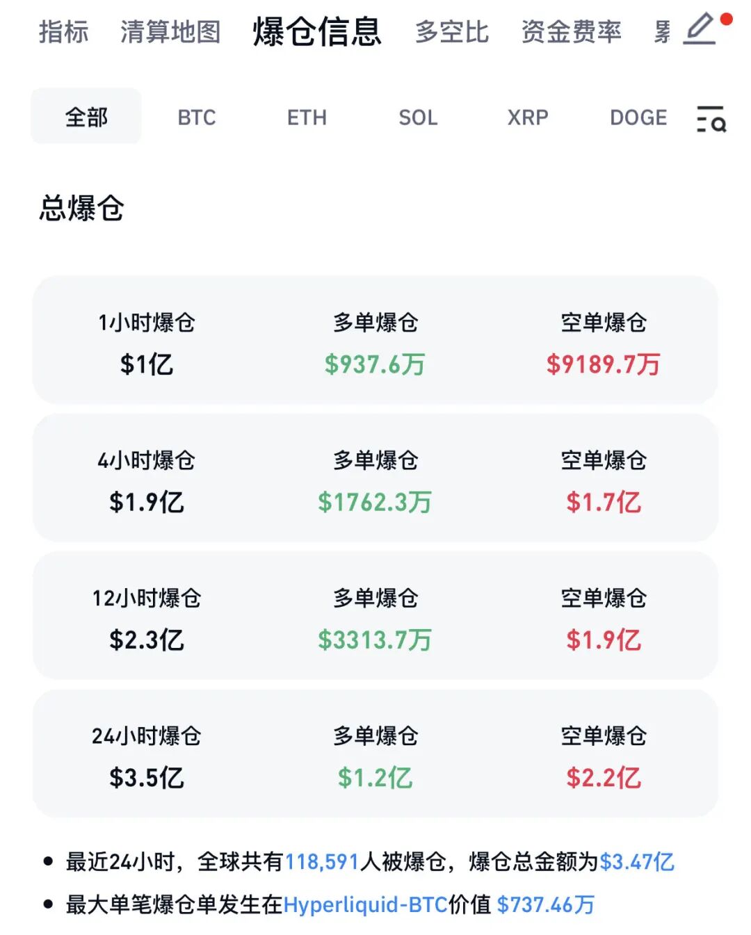 CoinGlass显示,近24小时全球共有近12万人爆仓,爆仓总金额为3.47亿美元。
