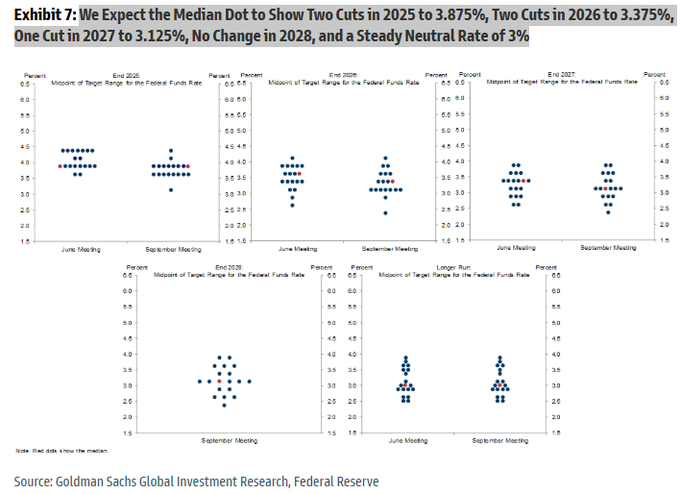 高盛也有类似的预测:该行同样预计点阵图显示年内降息两次——即本月降息后年底再降息一次,利率中值落至3.875%。