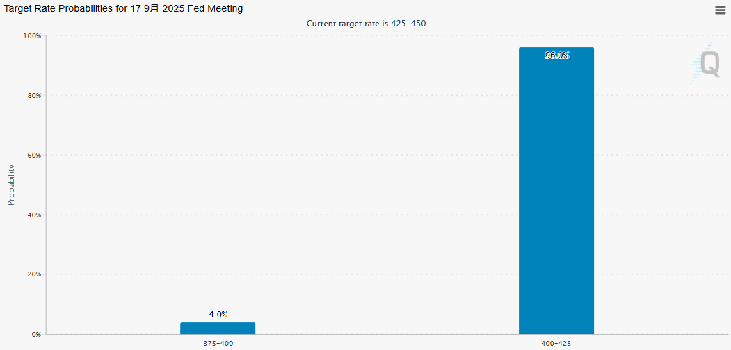 根据芝商所的美联储观察工具显示,美联储今晚降息25个基点的可能性约为96.0%,降息50个基点的可能性为4%。