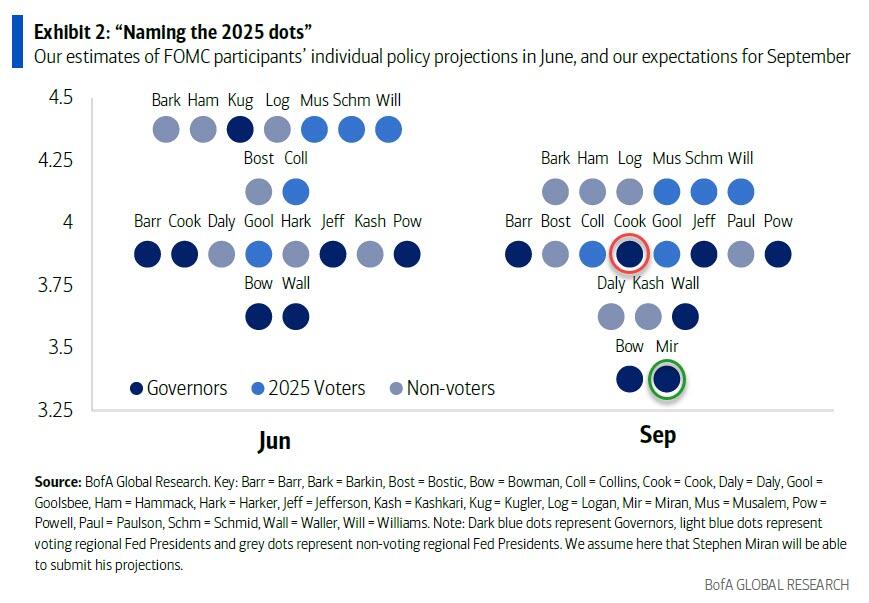 从业内人士的普遍分析来看,本次美联储点阵图的看点主要有三方面:首先最受瞩目的就是2025年的降息路径——若今晚降息25个基点,美联储在年内余下两次会议上还会降息几次;其次是,点阵图对2026年利率预测的离散度是否扩大,这可以反映美联储内部官员对明年政策路径的分歧是否在加剧;第三则是在米兰加入美联储后,美联储对长期中性利率的预测会作何调整?