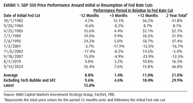 而从长期来看,历史表明,标普500指数在美联储首次或重启降息后的12至24个月内,大多都会出现正回报。下图是自1982年以来的历史回报情况: