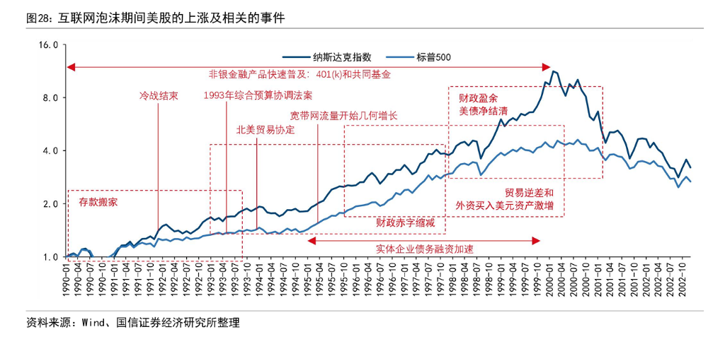 研报表示,回顾历史,互联网泡沫并非单纯的产业狂欢,而是特殊时代背景下资金与资产供需失衡的产物。彼时,美国正处于冷战结束后的“和平红利”期,财政盈余导致美债供应大幅减少,形成了严重的“资产荒”。与此同时,存款搬家与养老金制度改革(401k)促使非银金融爆发,叠加贸易自由化带来的巨额外资流入,海量资金涌入权益市场。