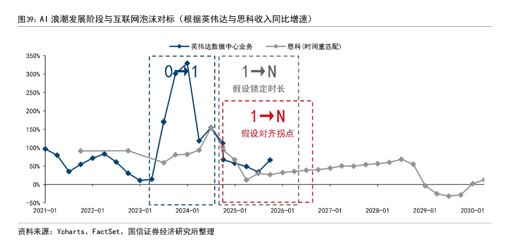 将视线拉回当下,通过对比关键指标,研报认为AI浪潮的时间进度条已走到类似1998年的位置。从产业链营收增速来看,互联网泡沫经历了铺垫期、“0→1”、“1→N”以及“N→N+”四个阶段。英伟达作为本轮AI浪潮的上游代表,其数据中心业务增速走势与当年的思科高度吻合。若以思科的历史轨迹推演,当前AI浪潮正处于营收增速边际回落但仍保持高位的“1→N”阶段。
