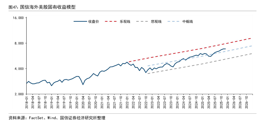 跨过这一调整期后,市场有望进入“N→N+”阶段,迎来类似1999年至2000年初的加速上涨。在基准假设下,2026年末标普500的中性点位有望达到7500点。若市场情绪进一步演绎,2027年末指数甚至可能冲击9600点。在这个过程中,纳斯达克指数预计将维持对标普500的超额收益,到2026年年中可能达到23500点附近,并在随后进一步拉大领先优势。当然,这一路径仍面临美联储货币政策、宏观经济预期及AI技术演进速度等多重不确定性因素的扰动。