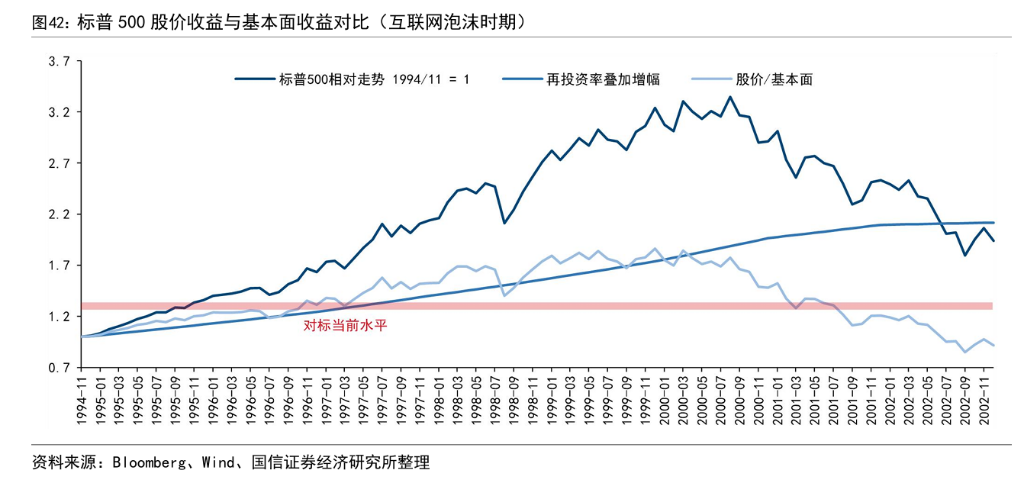 尽管AI概念股涨势惊人,但其泡沫化程度远未及互联网时代。报告利用“固有收益模型”对比发现,本轮标普500指数股价跑赢基本面(累计再投资率)的幅度约为27%,而互联网泡沫时期的这一数据在“1→N”阶段末期就已达到69%,在泡沫巅峰期更是高达84%。换言之,当前市场的估值溢价仅相当于互联网泡沫极限水平的约三分之一。
