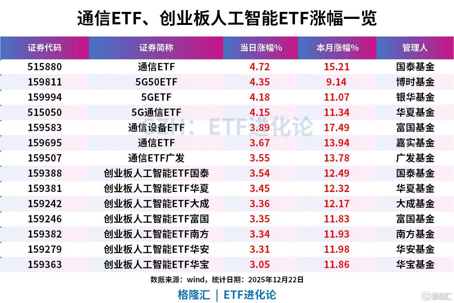 中际旭创涨超6%,天孚通信涨超4%,带动通信ETF、5G50ETF、5GETF、5G通信ETF涨超4%;通信设备ETF、通信ETF、通信ETF广发、创业板人工智能ETF国泰、创业板人工智能ETF华夏、创业板人工智能ETF大成、创业板人工智能ETF富国、创业板人工智能ETF南方、创业板人工智能ETF华安、创业板人工智能ETF华宝涨超3%。