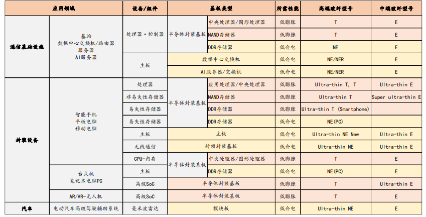 高性能特种玻纤布主要包括低介电电子布(Low-DK一代、Low-DK二代)和低膨胀(Low-CTE)电子布,下游终端分别应用于通信基础设施和半导体封装领域。特种玻纤布性能优越,显著优于传统玻纤布。Low-Dk纤维布,特征为低介电常数和低介电损耗因子,以日东纺产品系列为例,在1GHz的环境下,第一代Low-Dk玻纤布NE-Glass的介电常数低至4.8,介电损耗低至0.0015,普通玻纤布介电常数约为6.8,介电损耗约为0.0035;Low-CTE纤维布,特征为低热膨胀系数和高强度,主要用于高端芯片封装基材,Low-CTE玻纤布的热膨胀系数低至2.8×10-6/℃,传统玻纤布的热膨胀系数约为5.6×10-6/℃。