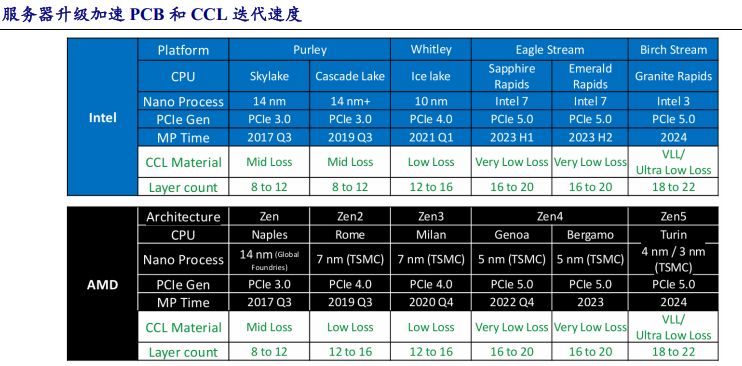 目前,不止英伟达GPU,海外亚马逊、谷歌、Meta等CSP厂商的ASIC芯片发展也进一步加速,整体增长弹性较大,在芯片升级且加速放量的背景下,交换机配套需求也显著增加,400G、800G等高传输速率交换机的渗透率进一步提升。随着人工智能、高频通信技术的加速演进,对AI服务器和高频高速通信网络系统的旺盛需求推动对大尺寸、高多层PCB和高频高速覆铜板的需求,PCB及CCL迭代速度也逐渐加快,PCB产品层数增加,高阶HDI应用占比提升,CCL材料向着低介电常数、低膨胀系数方向发展。