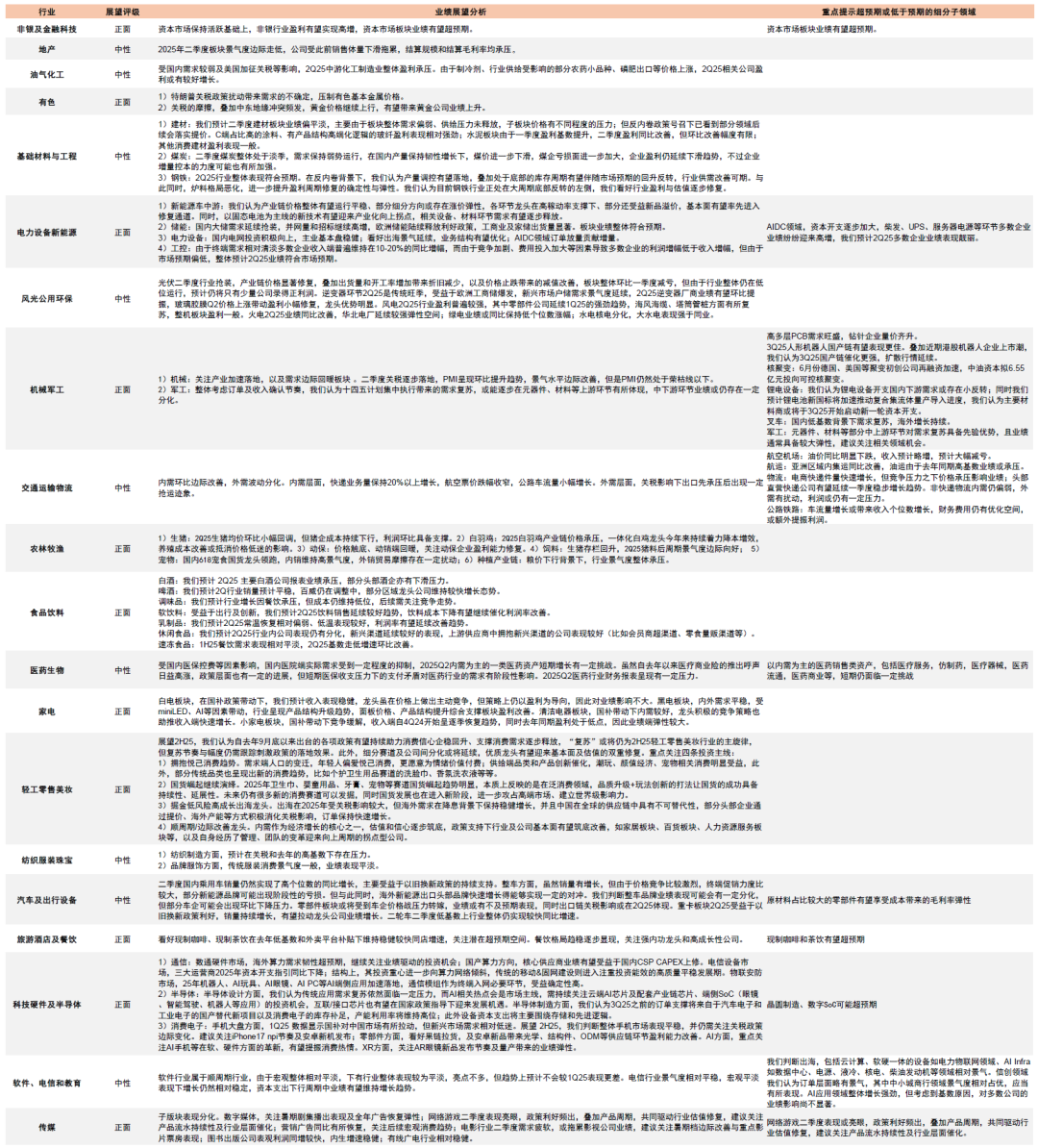 3)下游消费:必选消费方面,农林牧渔板块,生猪、白羽鸡等板块价格和成本同降背景下利润有支撑,粮价下行令种植板块承压;食品饮料板块,白酒承压,调味品、速冻食品因餐饮承压而显平淡,软饮受益于出行和创新;医药板块,受国内医保控费等因素影响,国内医院端需求受到一定程度的抑制,医药板块业绩整体仍承压。可选消费方面,现制咖啡、现制茶饮在去年低基数和外卖平台补贴下维持稳健较快同店增速,存在超预期空间;家电板块整体受益于以旧换新;汽车同样继续受益于以旧换新,但价格竞争下整车业绩或分化,同时零部件板块或也受车企竞争影响,叠加出口链关税影响,业绩或有不及预期表现,不过原材料占比较大的零部件企业有望享受成本带来的毛利率弹性;纺织板块,在美关税和去年的高基数影响下存在一定压力。有望超预期的领域包括:原材料占比较大的汽车零部件、现制咖啡和茶饮等。
