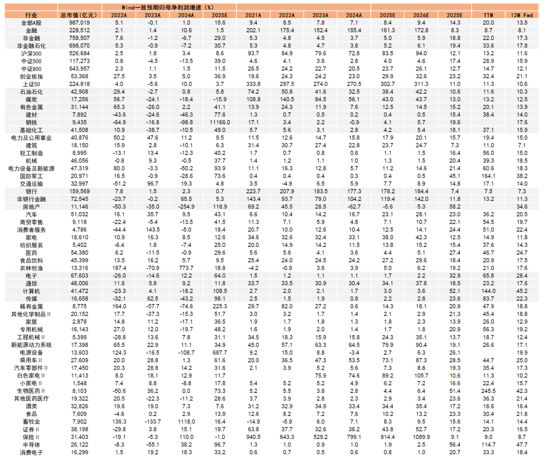 图表:A股分行业盈利与估值统计(预测值基于Wind一致预期,仅可比公司)