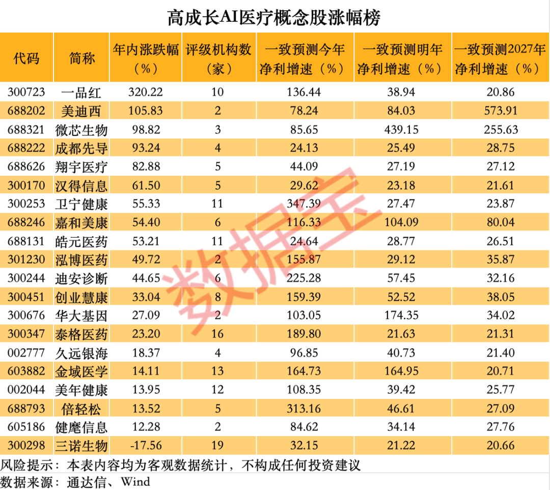 A股市场上和AI制药相关的概念题材是AI医疗,合计有82股。从未来成长性来看,根据两家以上机构一致预测,有20股今年、明年及2027年净利增速均超20%。这些高成长概念股主要集中在医药生物行业,和AI制药相关性较高的个股并不多,其中部分个股研报中有提及AI相关信息。