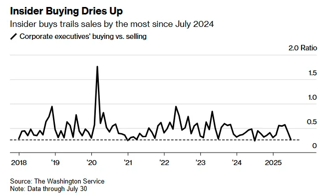 值得一提的是,企业内部高管们对股票的兴趣减弱,也正值美股上涨势头似乎开始放缓之际——甚至在上周五的大跌之前就已如此。标普500指数在7月的涨幅仅有2.2%,而在6月和5月则分别上涨了5%和6.2%。