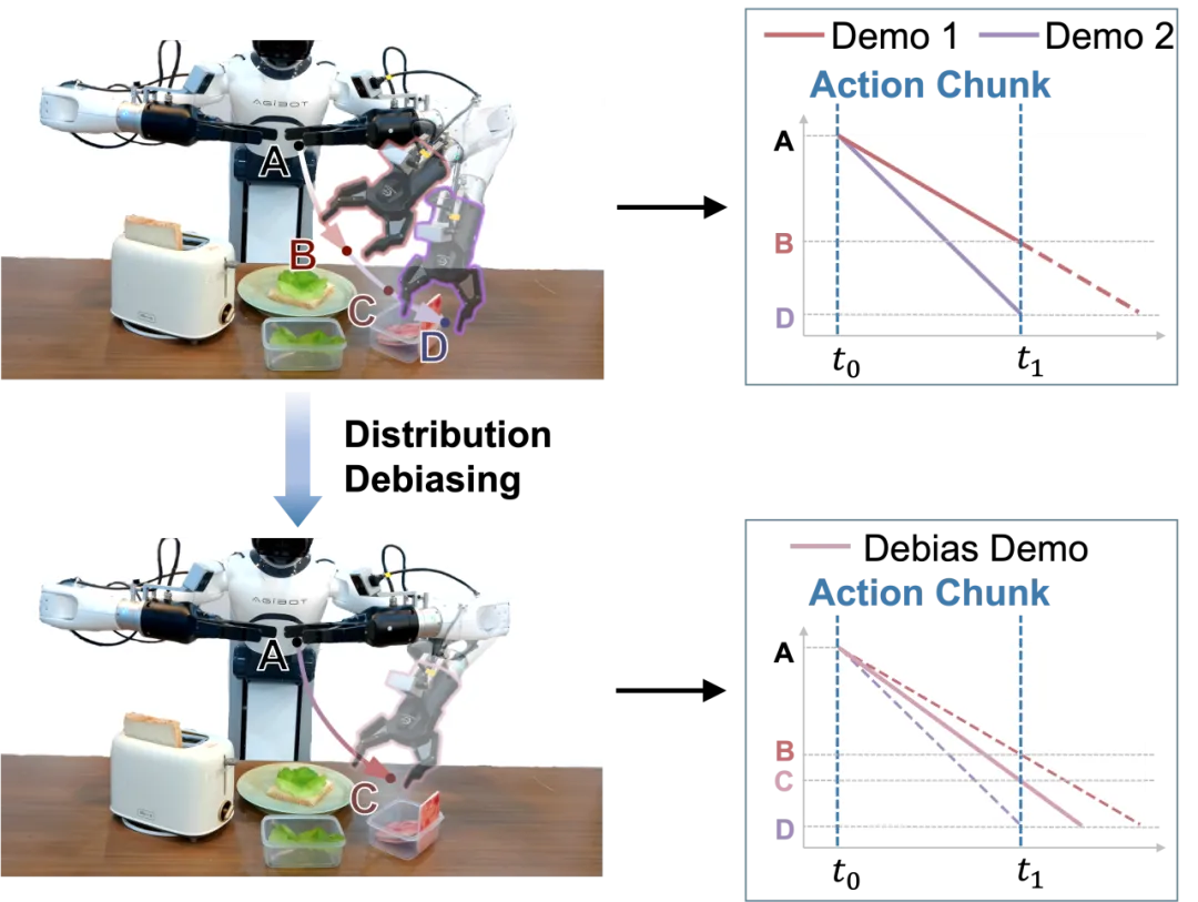这两种多模态性对学习具有完全不同的影响。空间变化代表了有意义的任务策略,这些多样化的解决方案应该被保留,因为它们丰富了模型对任务的理解,囊括更丰富的空间轨迹也可以防止模型推理时超出训练数据分布(OOD, out of distribution)。然而,速度变化往往引入了不必要的噪声,使当前基于动作块的模仿学习变得复杂化,因为模型需要同时学习这些分布特性,增加了学习难度而没有带来实质性的策略价值。