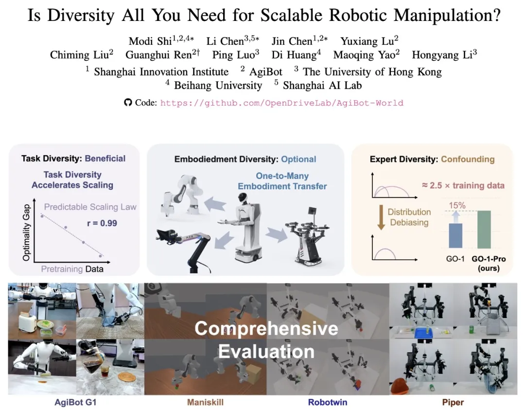 近日,由智元机器人和创智学院、香港大学等联合组成的研究团队发布了一项突破性研究成果,系统性地探索了机器人操作学习中数据多样性的三个关键维度:任务多样性、机器人本体多样性和专家多样性。这项研究颠覆了机器人学习领域"数据越多样越好"的传统认知,为构建可扩展的机器人操作系统提供了全新的理论指导和实践路径。