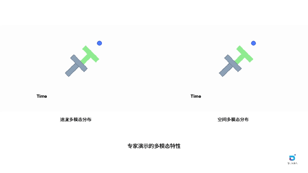 图中通过经典的PushT任务诠释了这一现象。在这个任务中,机器人(蓝色圆圈)需要将灰色的T形物体推动到绿色目标区域。尽管任务目标相同,但采集到的专家演示却表现出明显的多模态特征。空间多模态性体现在不同的轨迹选择上:机器人可以从T形物体的左侧或右侧接近,形成截然不同的空间路径,这反映了操作员对任务策略的不同理解。速度多模态性则发生在机器人以不同速度执行相似轨迹时:即使空间路径相近,不同的执行速度也会在时间维度上产生完全不同的演示轮廓,有些操作员动作迅速果断,有些则相对缓慢谨慎。
