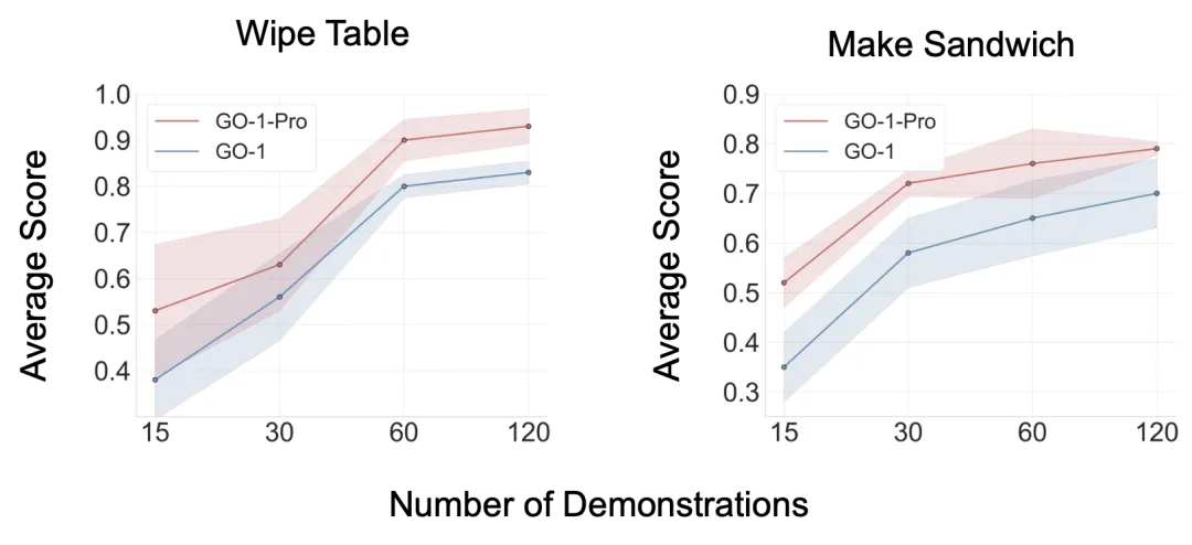 我们在擦桌子(Wipe Table)和制作三明治(Make Sandwich)两个代表性任务对分布去偏进行了验证,我们将经过分布去偏数据训练的模型命名为GO-1-Pro,实验结果发现GO-1-Pro在两个任务和所有数据规模上都稳定超越GO-1。值得注意的是,GO-1-Pro展现出卓越的数据效率——仅使用GO-1一半的训练数据就能达到相当或更优的性能,有效地将数据利用效率提升了一倍。