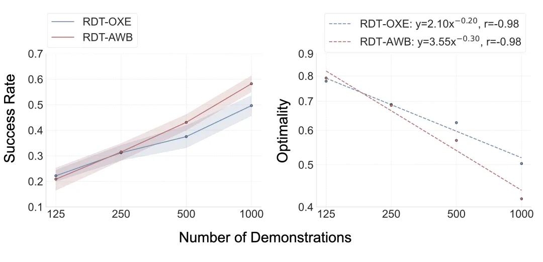 测试环境选择了三个机器人平台:ManiSkill仿真环境的Franka机械臂、RoboTwin仿真环境的Arx机械臂,以及真实世界Agilex环境的Piper机械臂。在ManiSkill环境的跨本体适应实验中,初期阶段RDT-OXE确实表现出"主场优势",在125个样本每任务时略胜一筹。然而转折点出现在250个样本时,RDT-AWB迅速追平RDT-OXE的性能,当数据量继续增加后,RDT-AWB开始反超并持续拉大差距,这种差距增长呈现幂律关系。这一结果表明,单本体预训练模型不仅能够实现有效的跨本体迁移,而且在数据扩展方面表现出更优的scaling特性。