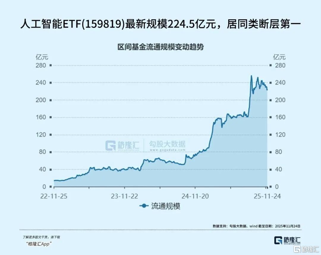 其中,一键打包AI各细分环节龙头公司,产业分布均衡的人工智能ETF(159819),年内净流入资金80.12亿元,最新规模224.5亿元,居同类断层第一,且为同标的中唯一规模超百亿的ETF;其综合费率0.2%,为全市场股票型ETF最低。