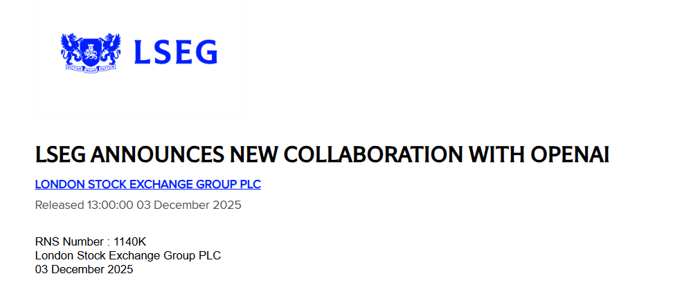 上证报中国证券网讯 伦敦证券交易所集团(LSEG)12月3日宣布与OpenAI达成新合作。