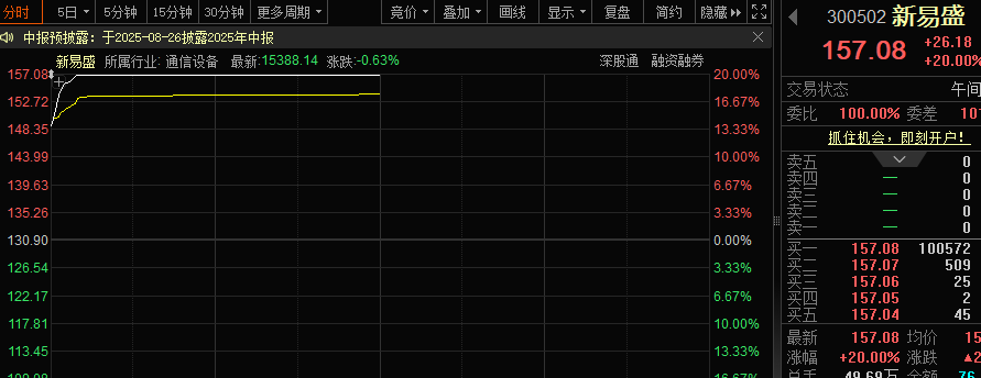 受业绩大幅增长刺激,AI算力核心标的新易盛开盘大涨,在开盘后10分钟内封住“20cm”的涨停板。公司昨晚发布业绩预告,预计2025年上半年净利润为37亿元至42亿元,同比增长327.68%至385.47%。报告期内受益于人工智能相关算力投资持续增长,产品结构优化,高速率产品需求持续增加,公司预计销售收入和净利润较上年同期大幅增加。