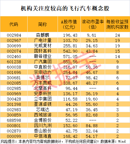 飞行汽车概念股中,谁最受机构青睐?据证券时报·数据宝统计,机构给予“积极型”评级(含买入、增持、强烈推荐等)家数最多的是森麒麟,合计有24家券商研报提及该股;广电计量、光威复材、国轩高科、赣锋锂业均有10家以上券商研报提及。