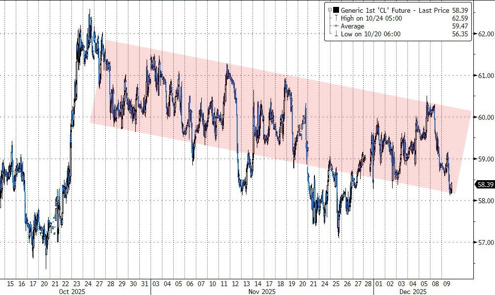 白银表现亮眼,强势突破60美元关口,刷新历史高位,显著跑赢黄金。美元韧性与对明年供需宽松的预期继续施压能源市场。WTI原油跌破关键技术位,回落至每桶58美元附近,延续了近期的颓势。
