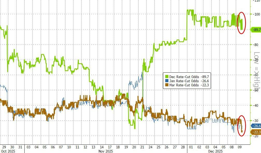 劳动力市场呈现出典型的“低招聘、低流动、裁员升温”的结构性降温特征——足以支持一次降息,却不足以支撑一条顺滑的持续宽松路径。市场对“鹰派降息”的定价进一步升温。本周美联储降息概率仍接近9成,但对2026年之后的降息预期明显回撤。