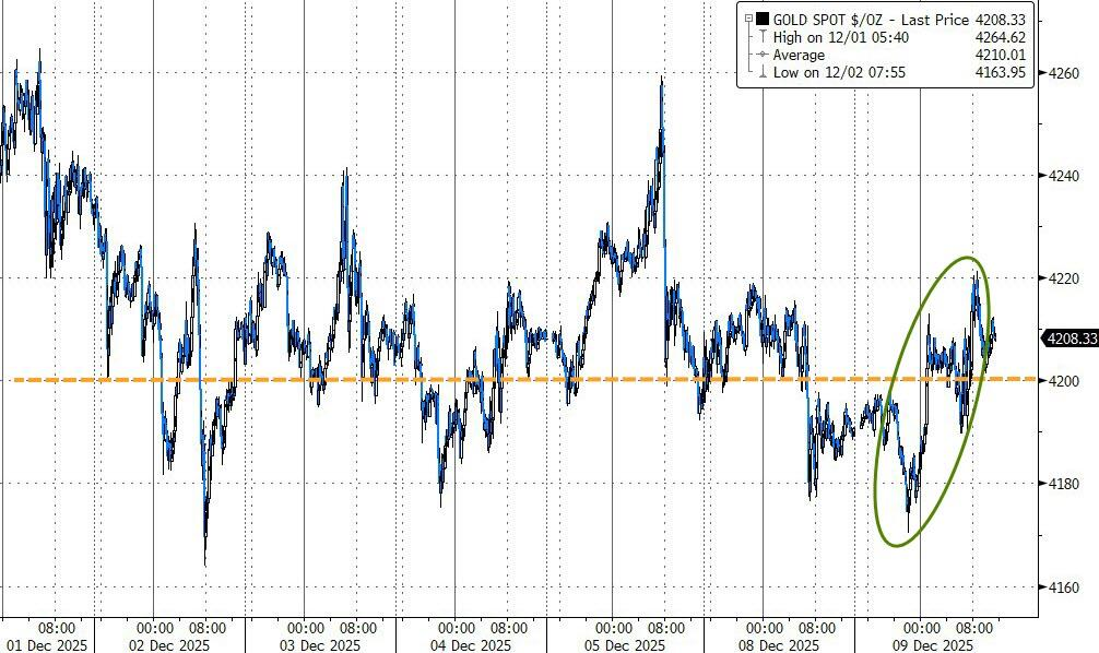 纽约尾盘,现货黄金涨0.44%,报4208.92美元/盎司,日内交投区间为4170.29-4221.39美元。