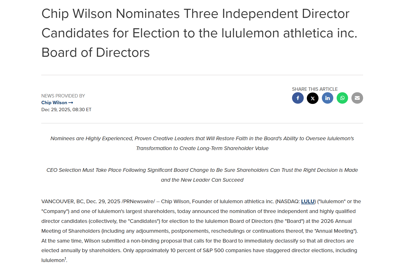 威尔逊在声明中表示,露露乐蒙要实现持续发展,亟需具备远见的创意型领导力,而公司现任董事会成员并不具备这些关键能力。他指出,引入新的领导层对于重新定义露露乐蒙,并开启公司下一阶段的成功篇章至关重要。