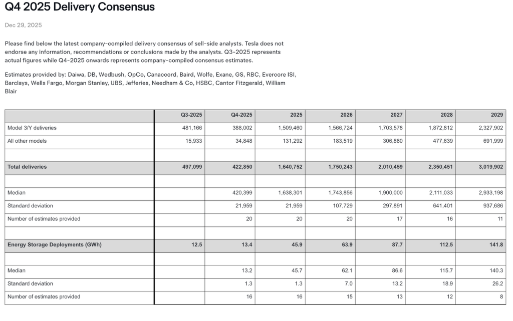 特斯拉周一在其网站上罕见发布了分析师预测汇总,数据显示,分析师平均预期特斯拉第四季度交付量为422850辆,同比下降15%。这一由公司内部汇总的预期数据,比彭博此前调查得出的平均值(445061辆,降幅10%)更为悲观。