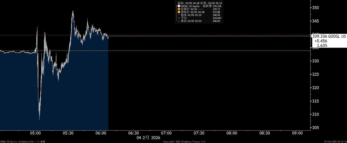 谷歌母公司Alphabet去年第四季业绩披露,预期2026年的资本开支将达到1750亿至1850亿美元,以捕捉AI投资与基础设施带动增长的机遇,金额较2025年大增91%-102%。盘后A股股价一度闪跌7.5%至308美元,之后仅跌0.7%,报332美元。