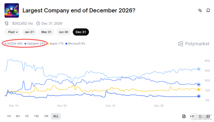 据预测市场Polymarket最新的数据,Alphabet在2026年12月前成为全球最大公司的概率已达到24%,仅次于英伟达的48%。