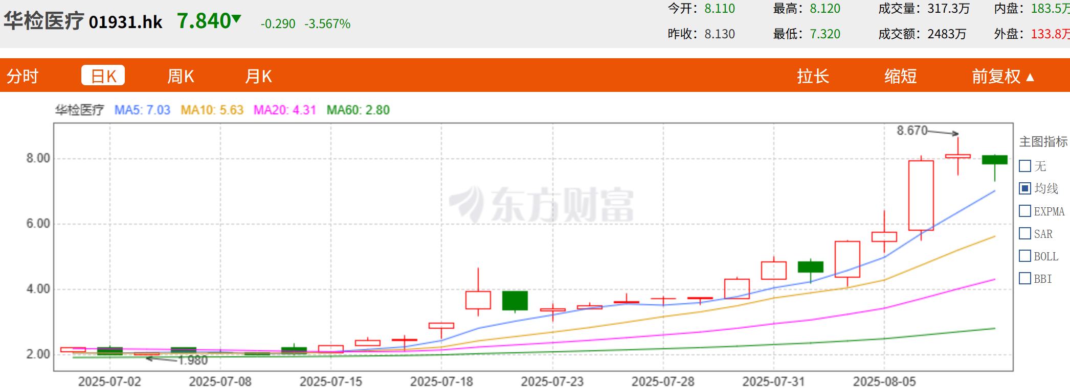 2025年8月8日,以太币(ETH)收于4008.96美元,创年内新高。而港股公司华检医疗(01931)的首批5190枚以太币(ETH)购入价仅为3661美元/枚,单日浮盈180.59万美元(约1417.64万港元)。这一精准抄底,成为其启动“亚洲首家以太坊金库”战略的“神来之笔”。