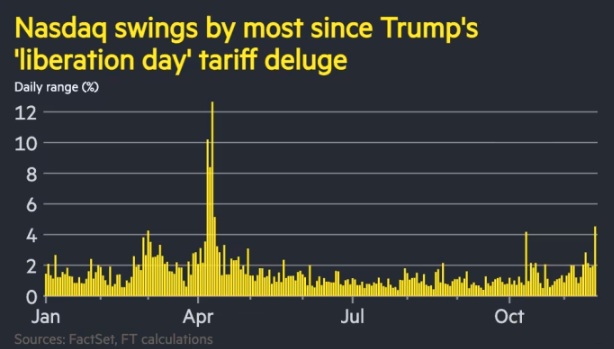 在最受市场关注的科技股方面,科技巨头股价隔夜引领纳斯达克100指数下挫,该指数收盘下跌2.4%,自10月29日创下历史新高以来累计跌幅扩大至7.9%。特斯拉、谷歌母公司Alphabet、苹果微软博通亚马逊等公司的市值单日波动均超过1000亿美元。衡量纳斯达克100指数预期波动率的指标VXN自4月以来首次升至32以上。