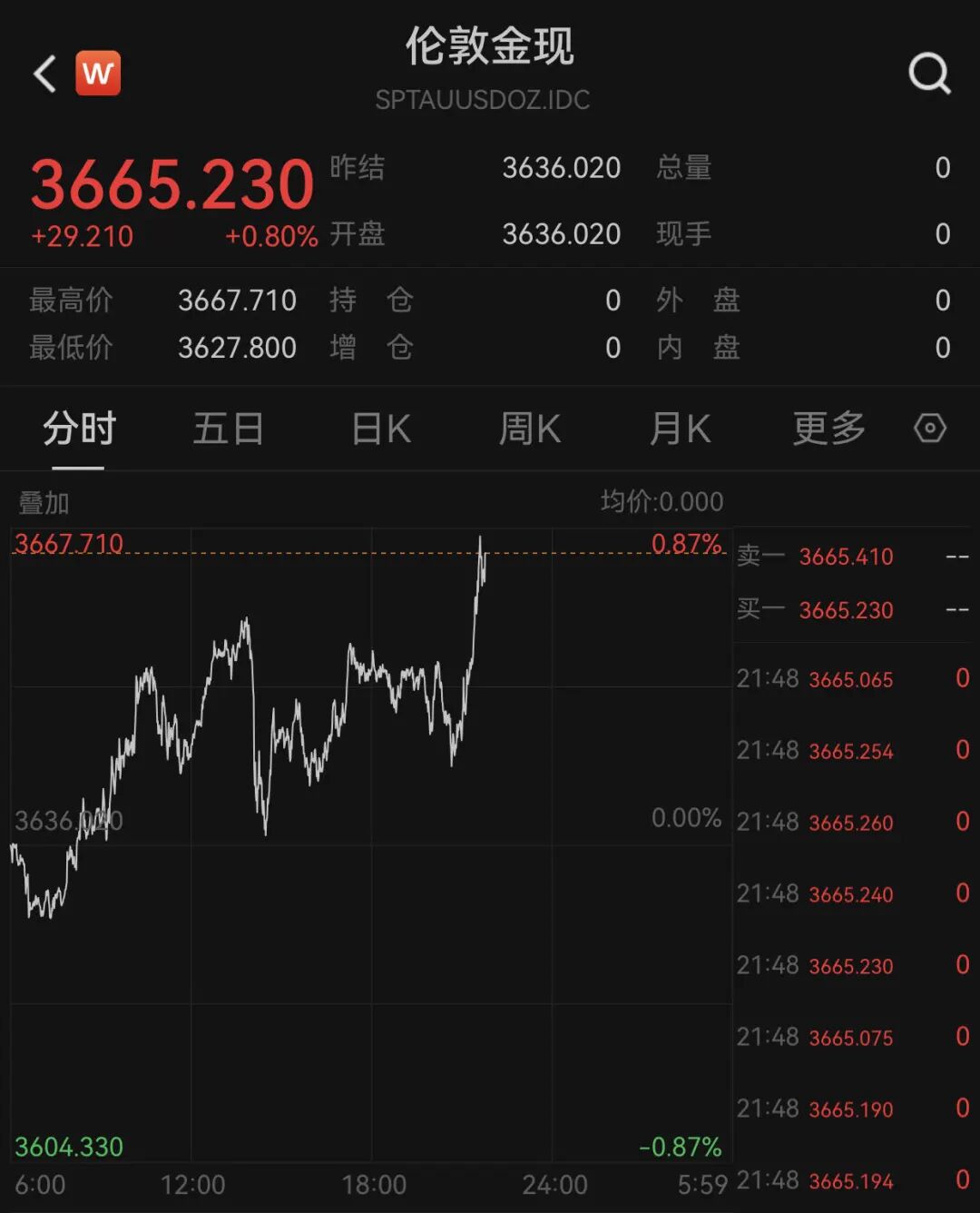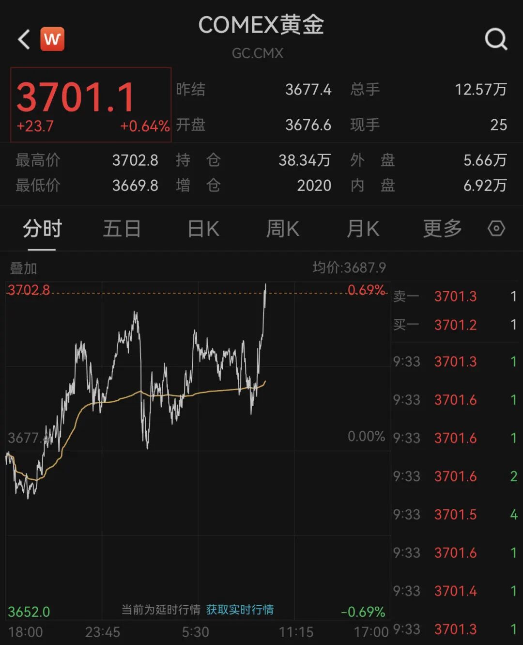 其他市场方面,COMEX黄金震荡上行,站上3700美元/盎司,再创历史新高,年内涨超40%;现货黄金涨0.8%,突破3660美元/盎司,续创历史新高。