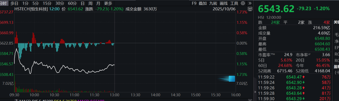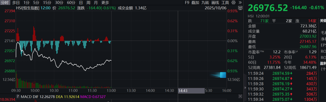 10月6日,港股继续调整。恒生指数低开后震荡走低,盘中最大跌幅一度达0.93%,随后有所反弹。截至早盘收盘,恒生指数报收26976.52点,下跌0.61%。恒生科技指数延续类似走势,截至早盘收盘,跌幅为1.2%。