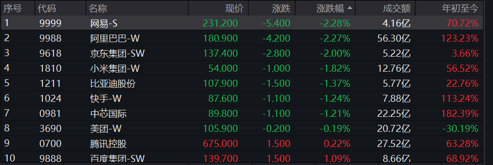 港股科技龙头股中,网易、阿里巴巴和京东集团分别下跌2.28%、2.27%和2%,小米集团和快手跌幅也在1%以上。百度集团和腾讯控股收红,分别上涨1.09%和0.22%。