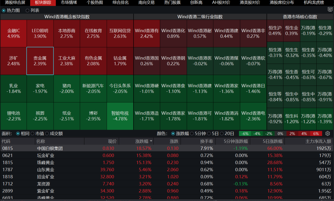 在波动中,港股市场也有亮点。板块中,贵金属涨幅居前,上涨2.39%。其中,中国白银集团上涨18.57%,坛金矿业和珠峰黄金涨幅也分别高达15.38%和15.13%,山东黄金、招金矿业等个股涨幅居前。
