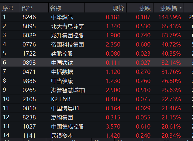 此外,中华燃气(08246.HK)一度大涨超300%,截至早盘收盘,该股仍涨144.59%,股价报0.181港元/股。该公司此前公告称,公司10月3日(交易时段后)与认购人订立认购协议,认购人有条件同意认购而公司有条件同意配发及发行合共3.34亿股认购股份,认购价为每股0.075港元。据悉,这一认购价较10月3日收盘价每股0.074港元溢价约1.35%。北大青鸟环宇和龙升集团控股涨幅也分别达65.43%和63.79%。