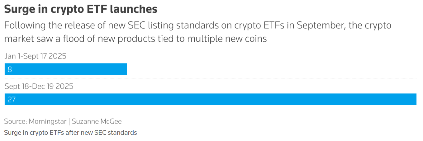 晨星公司的数据显示,自 9 月引入通用上市标准以来,新的加密货币 ETF 数量有所增加。Bitwise 资产管理公司近期预测,2026 年可能还会有 100 只相关产品面世。此外,间隔基金(Interval funds,一种投资于私人资产的封闭式基金)也有所增加,因为它们被视为能从退休计划的开放中获益。