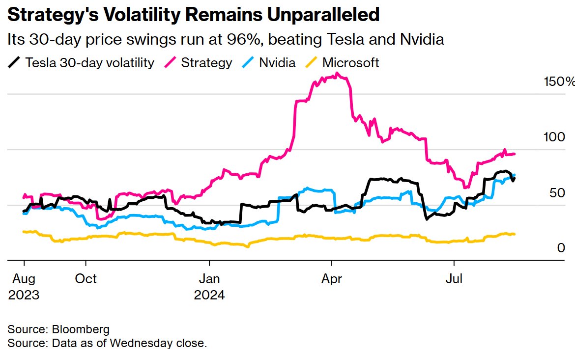 此外还有该公司著名的波动性。MicroStrategy的30日价格波动率达96%,超过英伟达的77%和特斯拉的74%。这可能引起肩负维护指数完整性职责的守门人的警惕。试图提前布局指数纳入的日内交易者近期也遭受损失:Robinhood Markets因入选传闻在6月飙升,却因最终落选而暴跌。